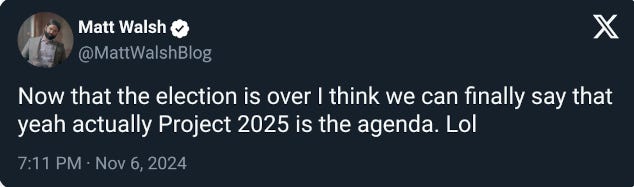 Conservative commentator Matt Walsh saw it coming. “Now that the election is over I think we can finally say yeah Project 2025 is the agenda.”