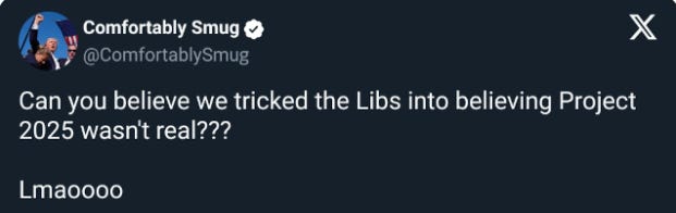 Walsh wasn’t alone. Comfortably Smug posted, “Can you believe we tricked the Libs into thinking Project 2025 wasn’t real?”