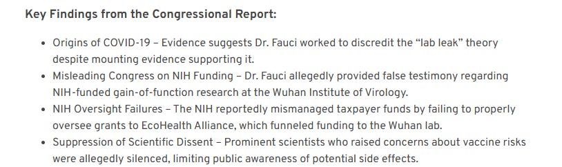 Key findings from a recent congressional report show how Fauci mishandled funding, was dishonest with the public about the lab leak theory, and silenced credible voices who opposed the prevailing Covid narratives. After all of this, he arrogantly lied to Congress and continued to behave like a weasel while he covered his tracks.