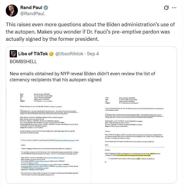 “Makes you wonder if Dr. Fauci’s pre-emptive pardon was actually signed by the former president.”