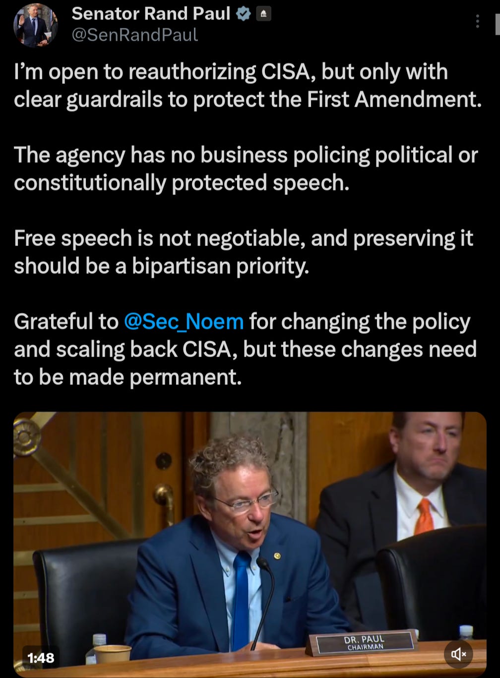 Grateful to Sec_Noem for changing the policy and scaling back CISA, but these changes need to be made permanent.
