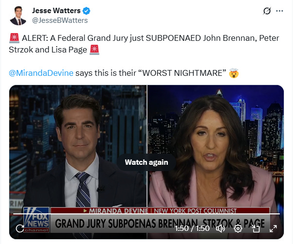 Along with Brennan, “ex-Director of National Intelligence James Clapper and former FBI officials Peter Strzok and Lisa Page were among more than two dozen people subpoenaed” as part of a DOJ investigation into the infamous 2016 Russian Collusion Hoax.