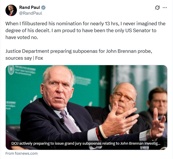 Imagine if Rand Paul had succeeded in blocking Brennan’s nomination over a decade ago. The Russian Collusion Hoax may never have made it out of the gates. Without CIA approval, the coup conspiracy might have been dead in the water.