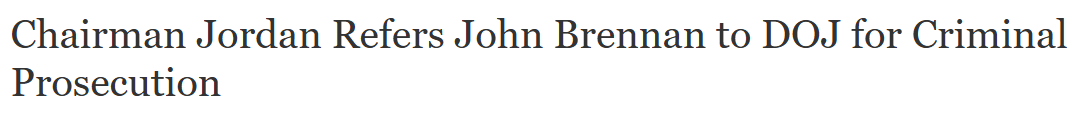 In late October, Jordan referred John Brennan to the Department of Justice for criminal prosecution.