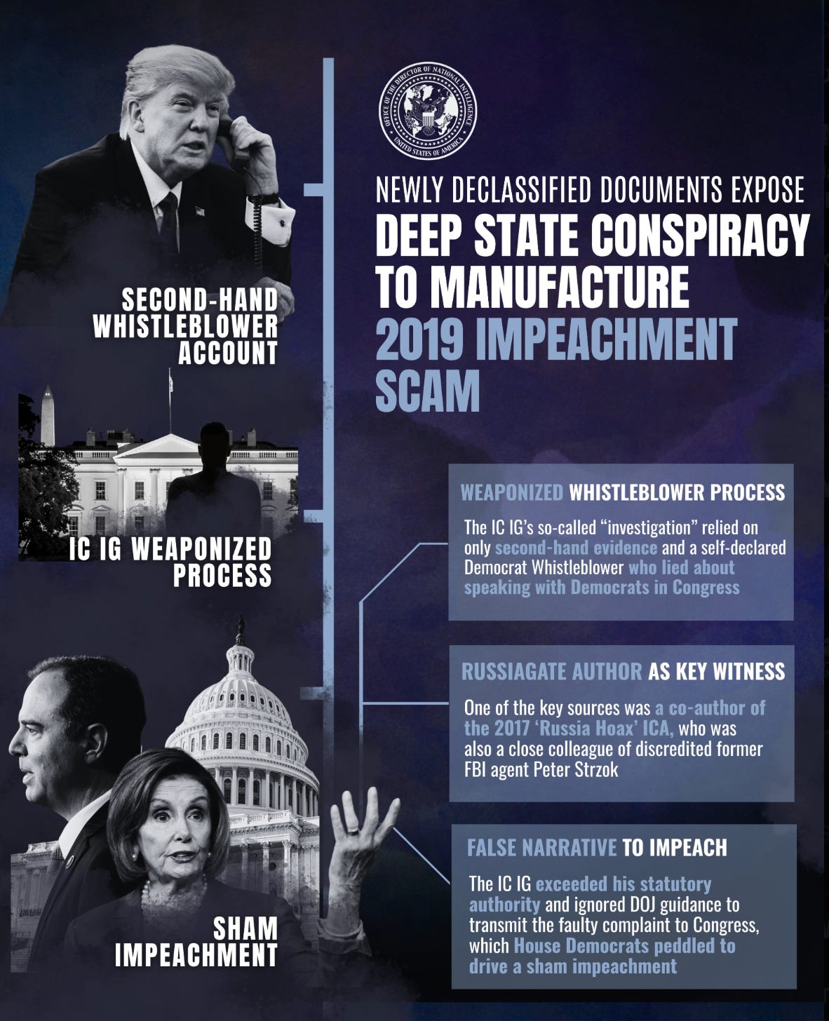 DNI Gabbard’s report revealed how Deep State operatives within the Intelligence Community “concocted a false narrative that Congress used to usurp the will of the American people and impeach duly-elected President Donald Trump in 2019.”