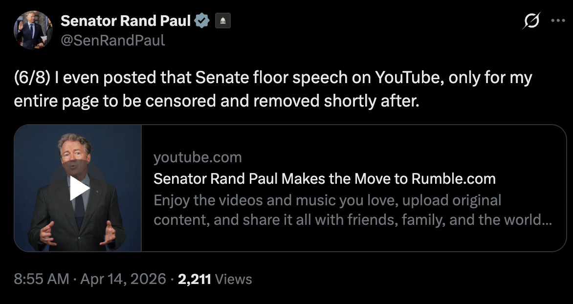 That’s right - YouTube actually censored the speech of an American senator speaking in Congress: