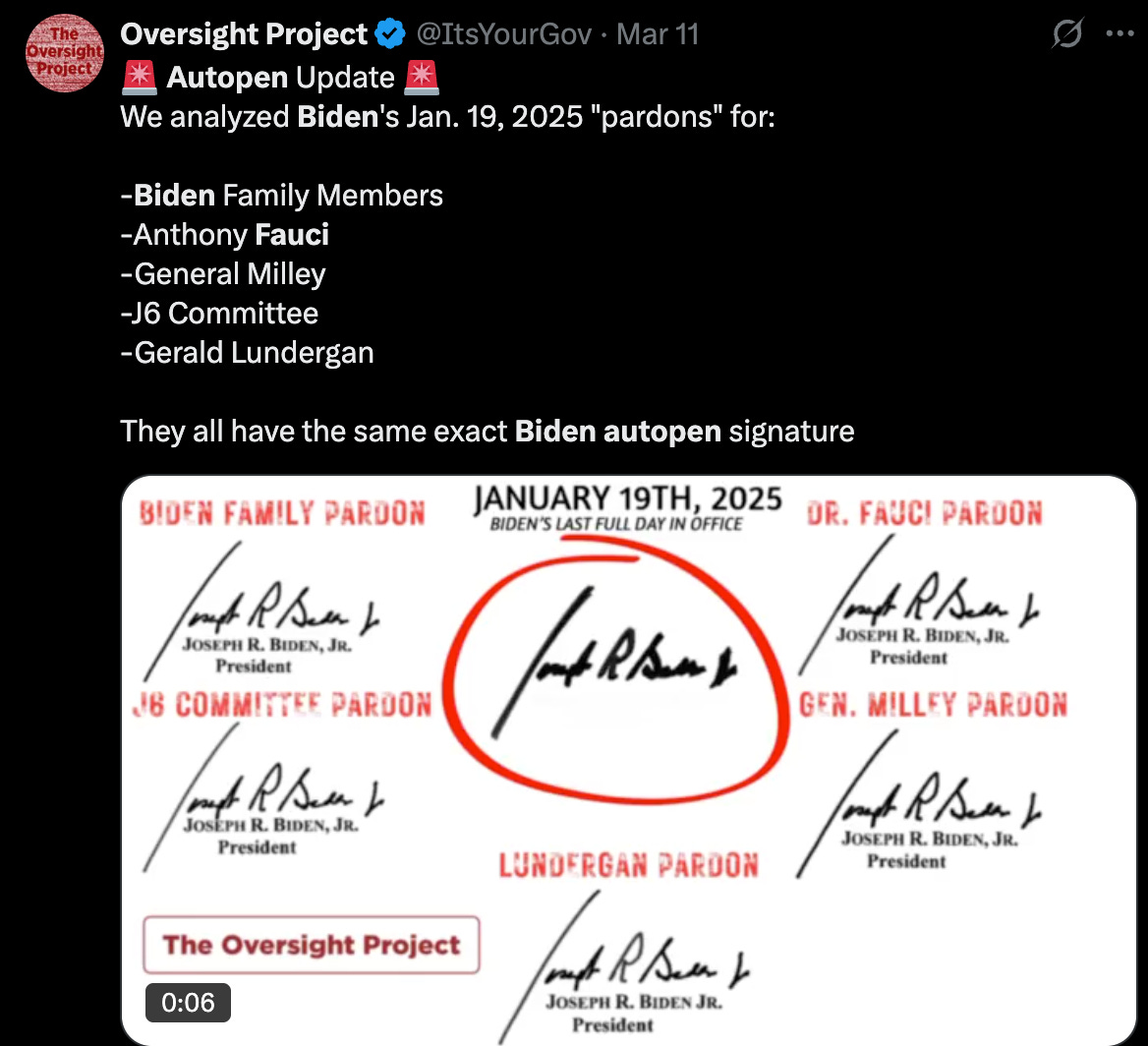 One watchdog group, The Oversight Project, first revealed the many number of executive orders that were likely signed not by Biden, but by people acting on his behalf with the autopen. The Oversight Project revealed that the autopen seemed to be in heavy use when Biden was on vacation in St. Croix, and other times when he was physically absent.