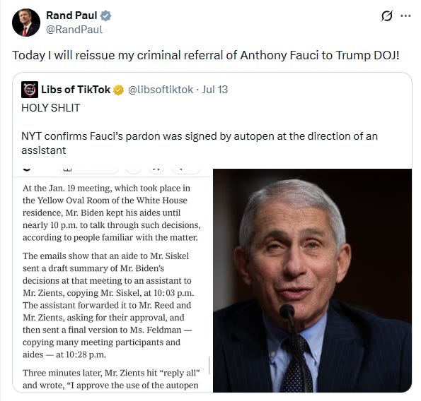 Sen. Paul still wants him held accountable. In July, he relaunched his bid to have a criminal probe look into Fauci’s lies.
