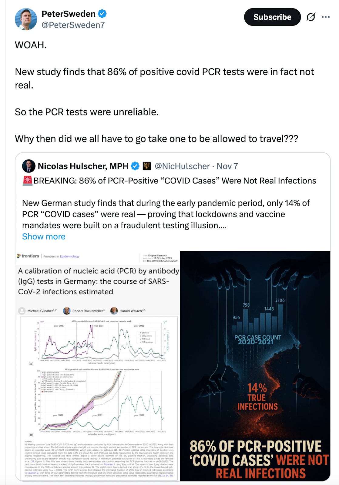 A peer-reviewed study out of Germany just confirmed that polymerase chain reaction (PCR) tests were total BS. 86% of positive results given by PCR tests were not real Covid infections. Only 14% of all Covid-positive PCR test results were real. And yet they made people use the PCR test to determine if they were “safe to travel” or “safe to go to work.”