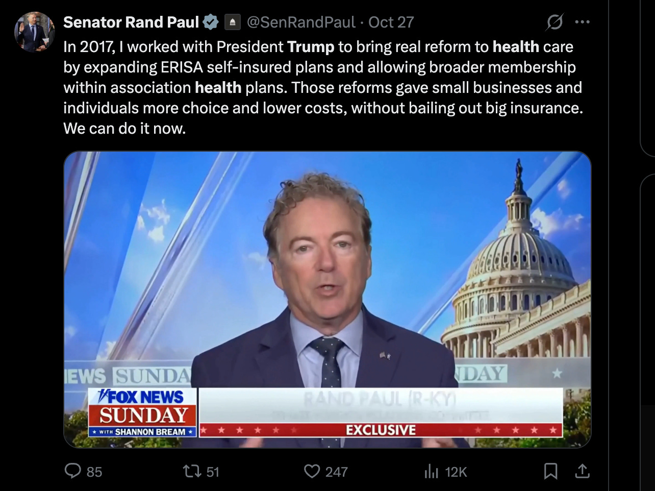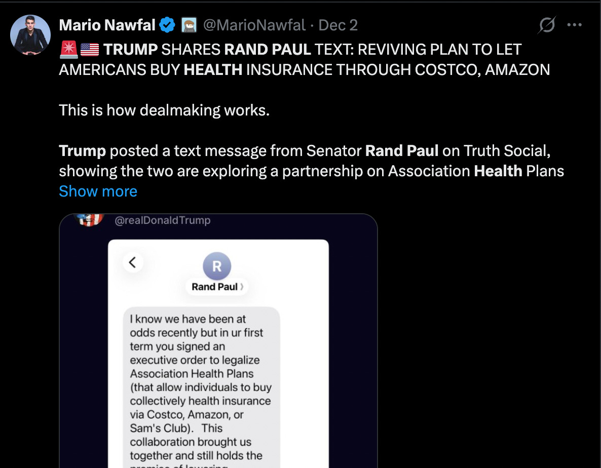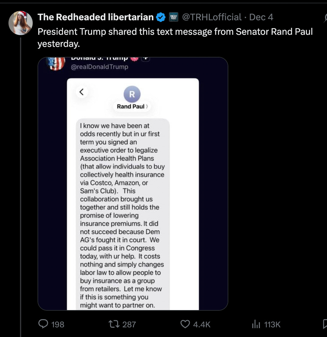 Sen. Paul wrote, “I know we have been at odds recently but in ur first term you signed an executive order to legalize Association Health Plans (that allow individuals to buy collectively health insurance via Costco, Amazon, or Sam’s Club).”
