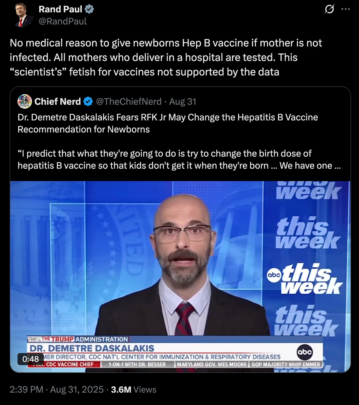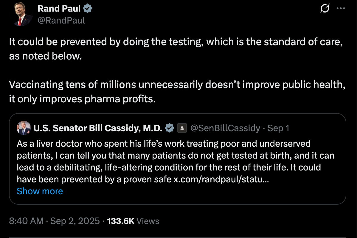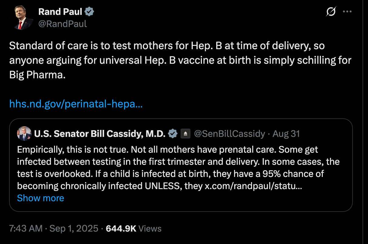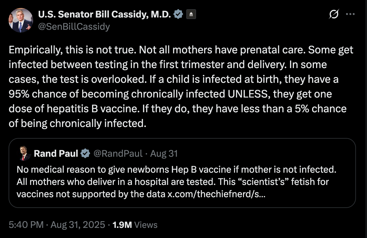 Rand Paul got into it on X with Republican Senator Bill Cassidy on Sunday about the necessity of giving newborns the hepatitis B vaccine.