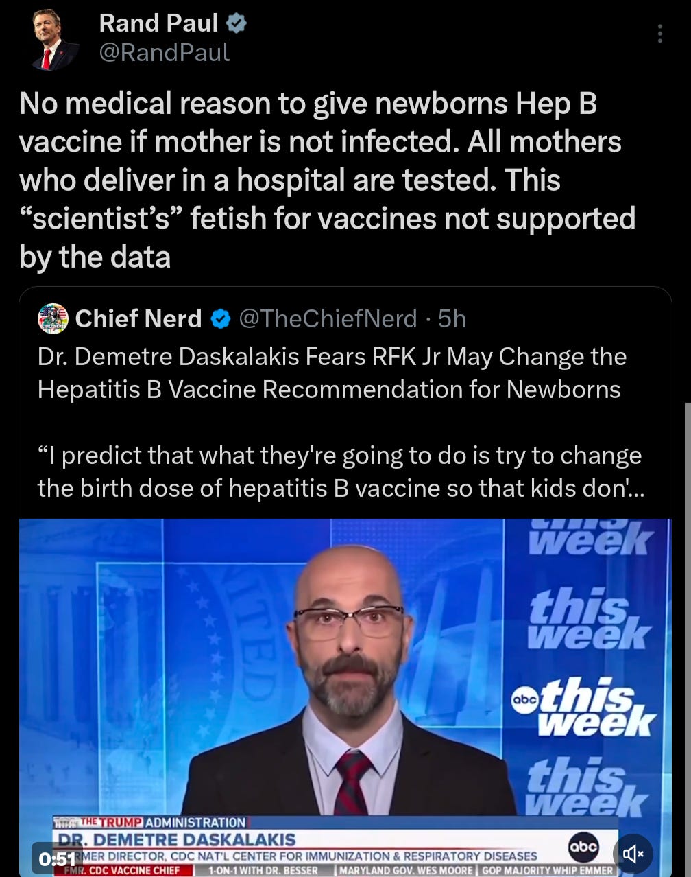 No medical reason to give newborns Hep B vaccine if mother is not infected. All mothers who deliver in a hospital are tested. This “scientist’s” fetish for vaccines not supported by the data — Senator Rand Paul