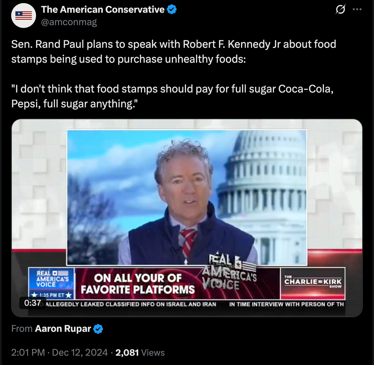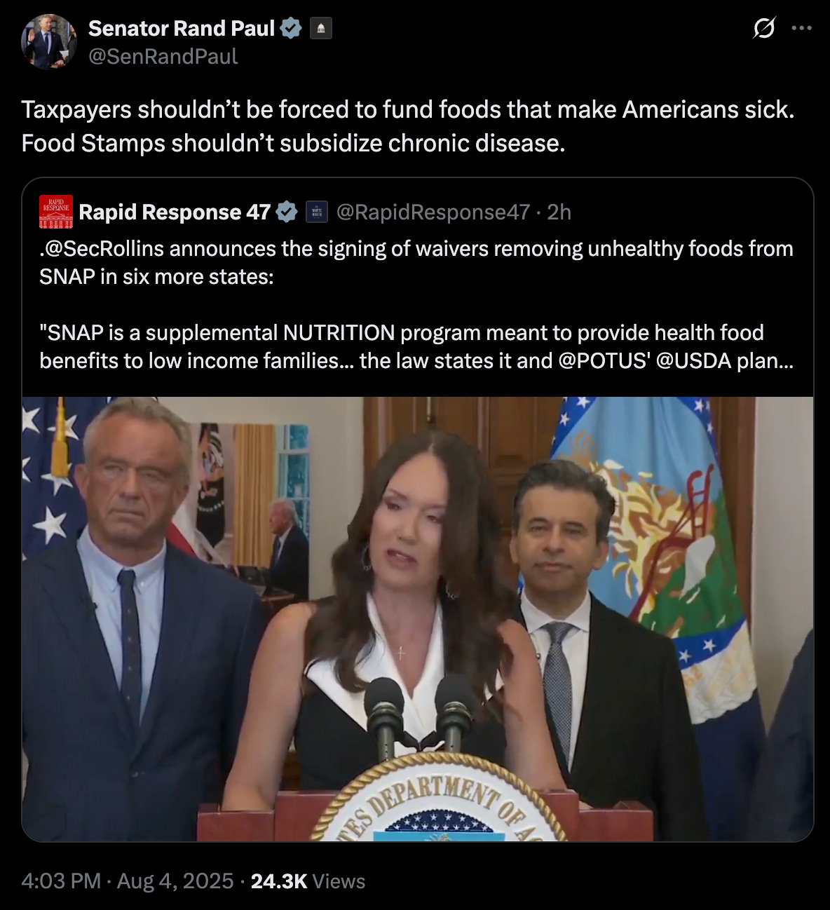 Sen. Rand Paul immediately praised the decision, making the point that taxpayers shouldn’t be paying for junk food for others in the first place, particularly given what it does to their health.