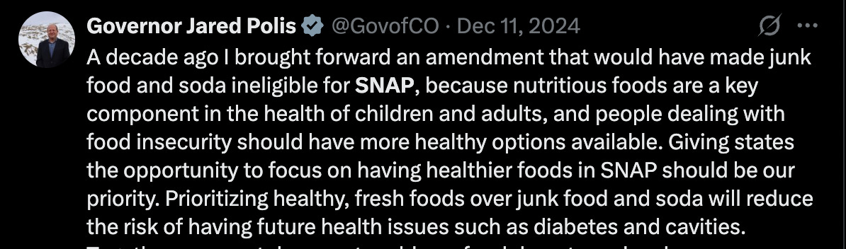 Rollins made clear that this wasn’t a partisan issue, noting that Colorado Governor Jared Polis recently became the first Democrat governor to request a waiver of sugary drinks from the states SNAP program.