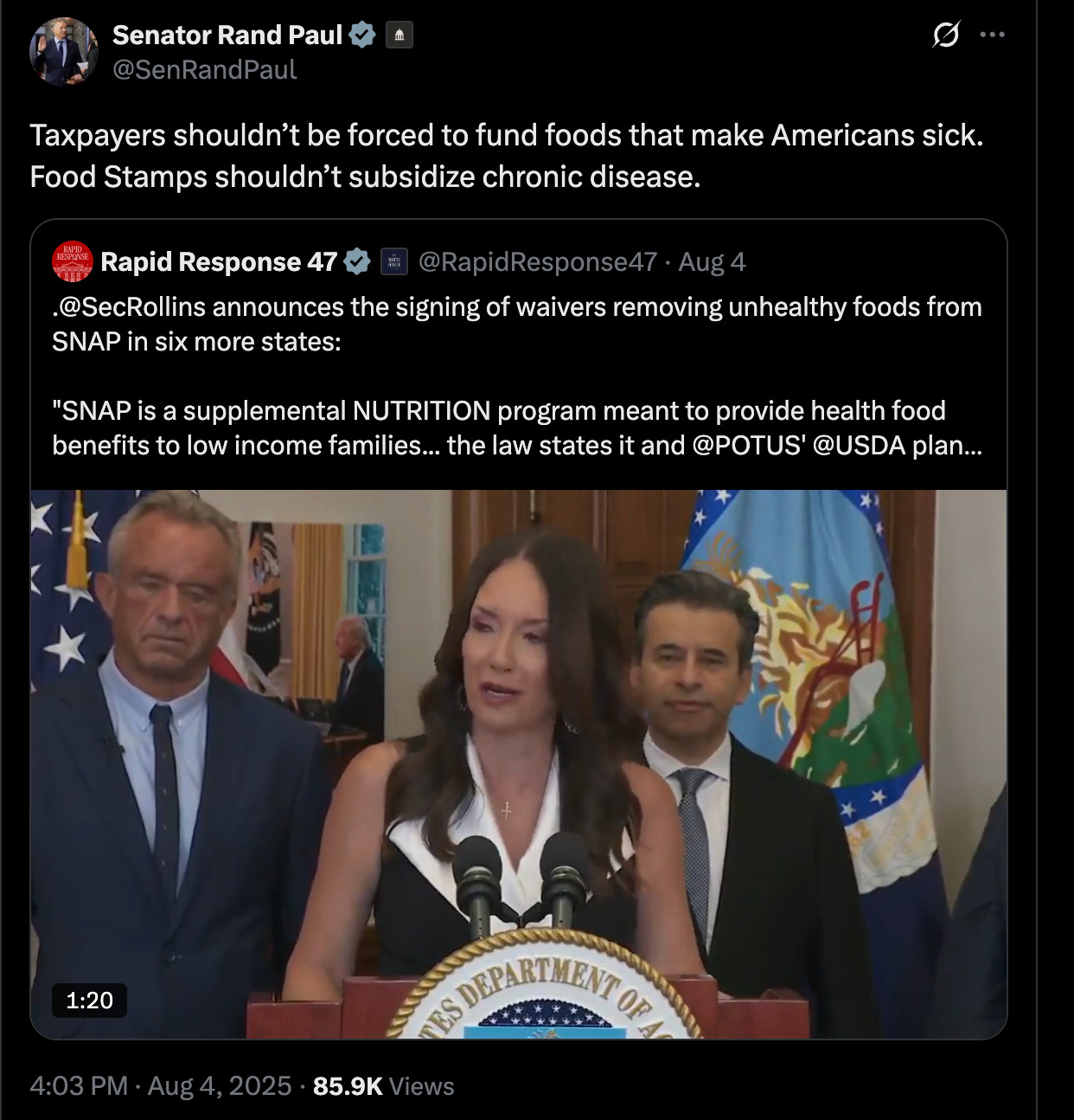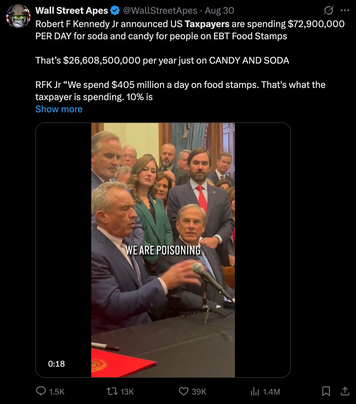 Secretary Kennedy broke this down in late August, “We spend $405 million a day on food stamps. That’s what the taxpayer is spending. 10 percent is going to sugary drinks. Another 8 percent is going to candies. So we are poisoning 60 percent of our kids who are getting food stamps.”
