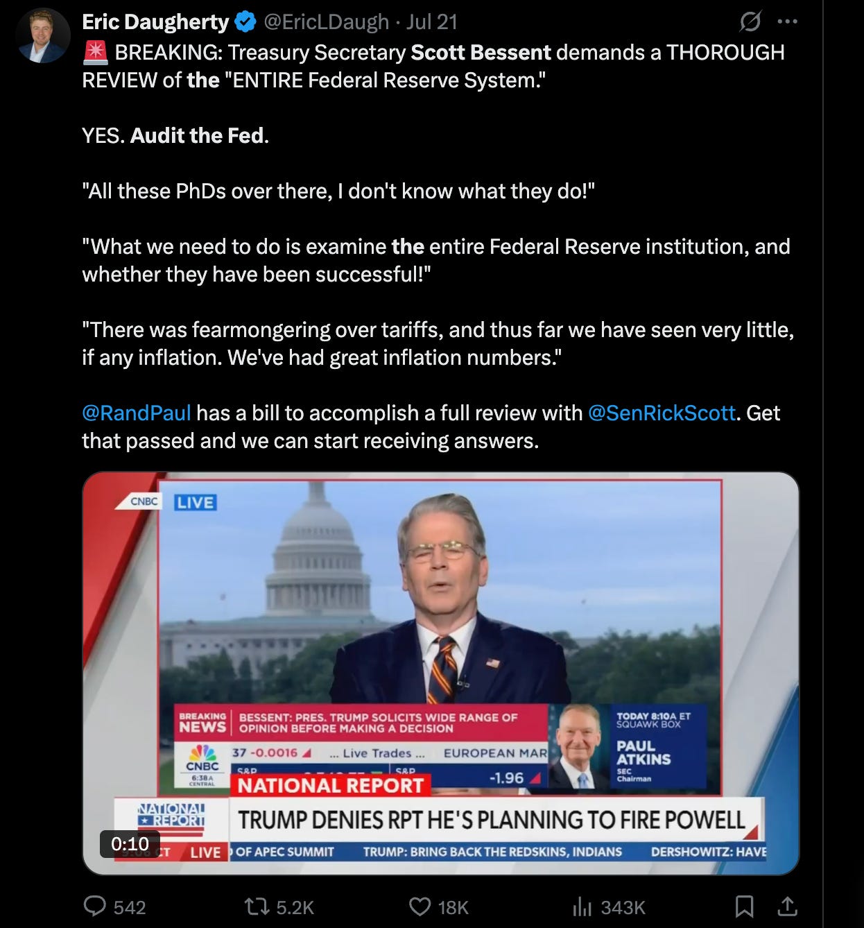 Bessent said we need to "examine the entire Federal Reserve institution and whether they have been successful[.] Has the organization succeeded in its mission?”
