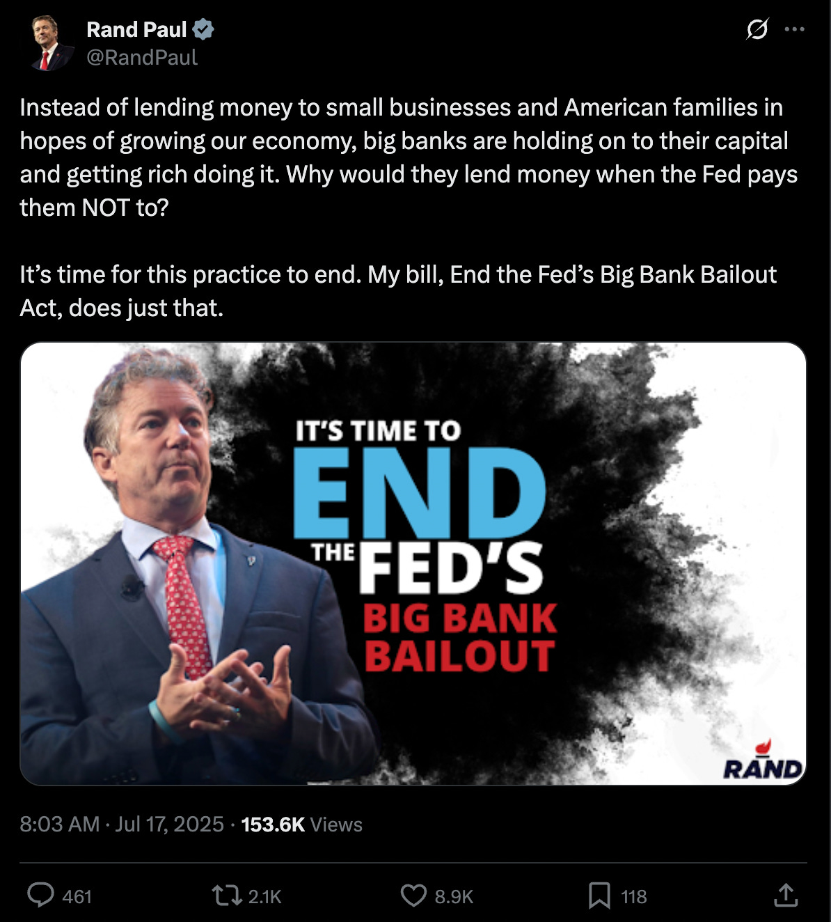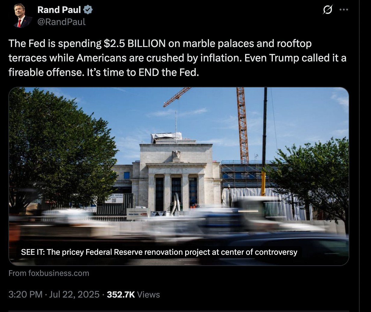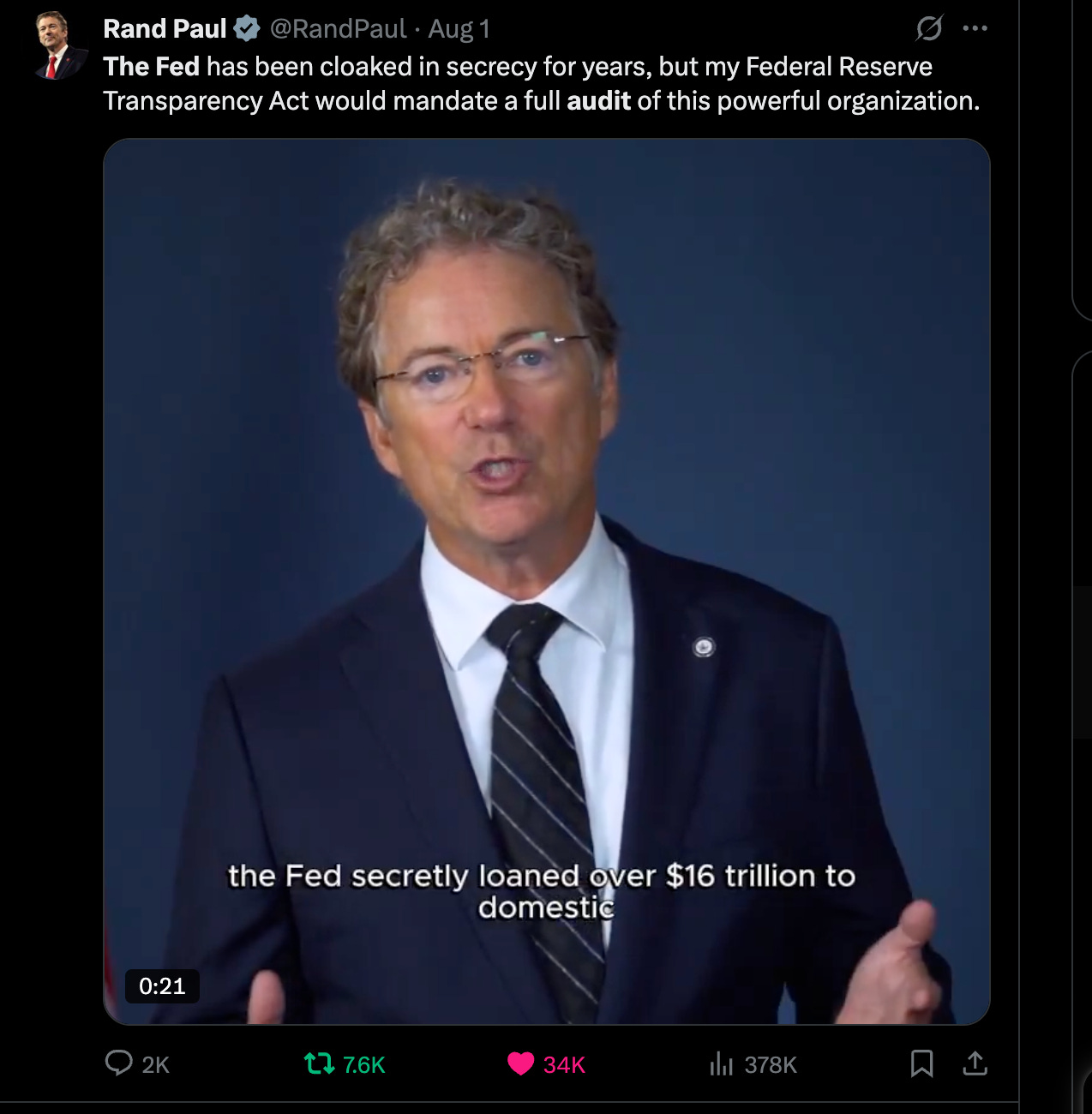 Sen Paul wrote on X in late July, “The Federal Reserve Transparency Act, famously known as ‘Audit the Fed,’ isn’t just legislation. It’s part of a movement my father, Ron Paul, started to bring sunlight to the most secretive institution in Washington.”
