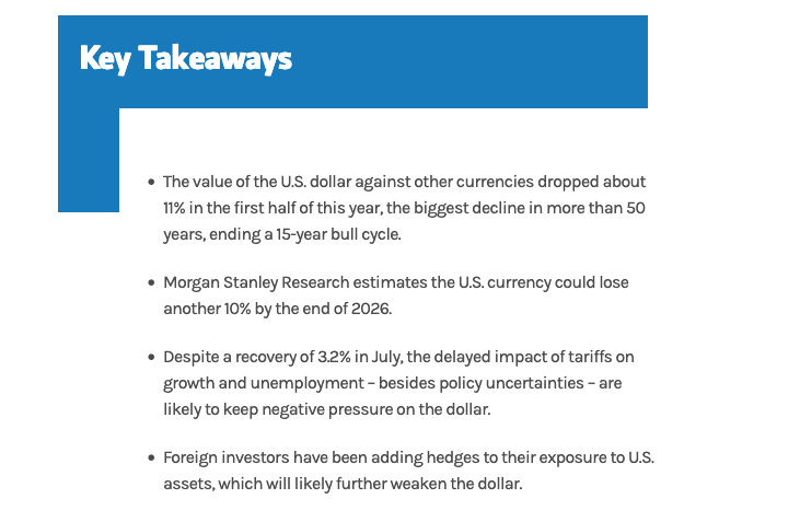 We are beginning to see even more weakness in the US dollar, most notably in 2025, and Morgan Stanley projects similar weakness in 2026.
