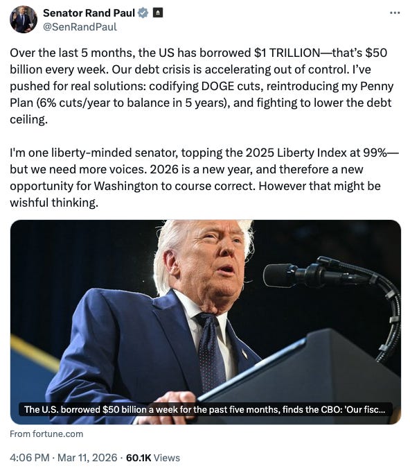 Rand Paul has slammed our recent war-driven debt accumulation and failure to implement all of the promised DOGE reforms.