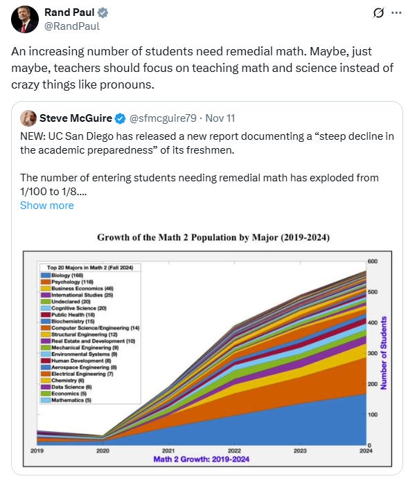 “An increasing number of students need remedial math. Maybe, just maybe, teachers should focus on teaching math and science instead of crazy things like pronouns,” Paul posted.