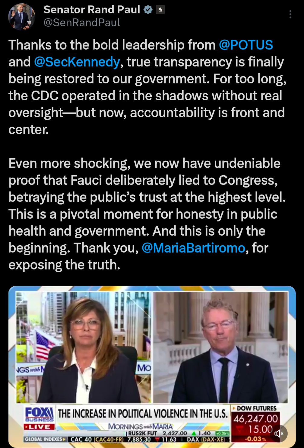 Even more shocking, we now have undeniable proof that Fauci deliberately lied to Congress, betraying the public’s trust at the highest level. This is a pivotal moment for honesty in public health and government. And this is only the beginning. Thank you, MariaBartiromo, for exposing the truth.