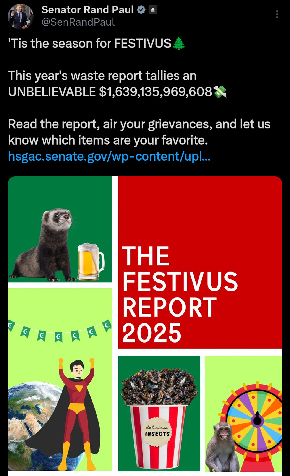 That’s why every year I compile a Festivus waste report. If you want to read it all, visit randpaul.com/festivus2025. But I’ll tell you about some of my favorites here: