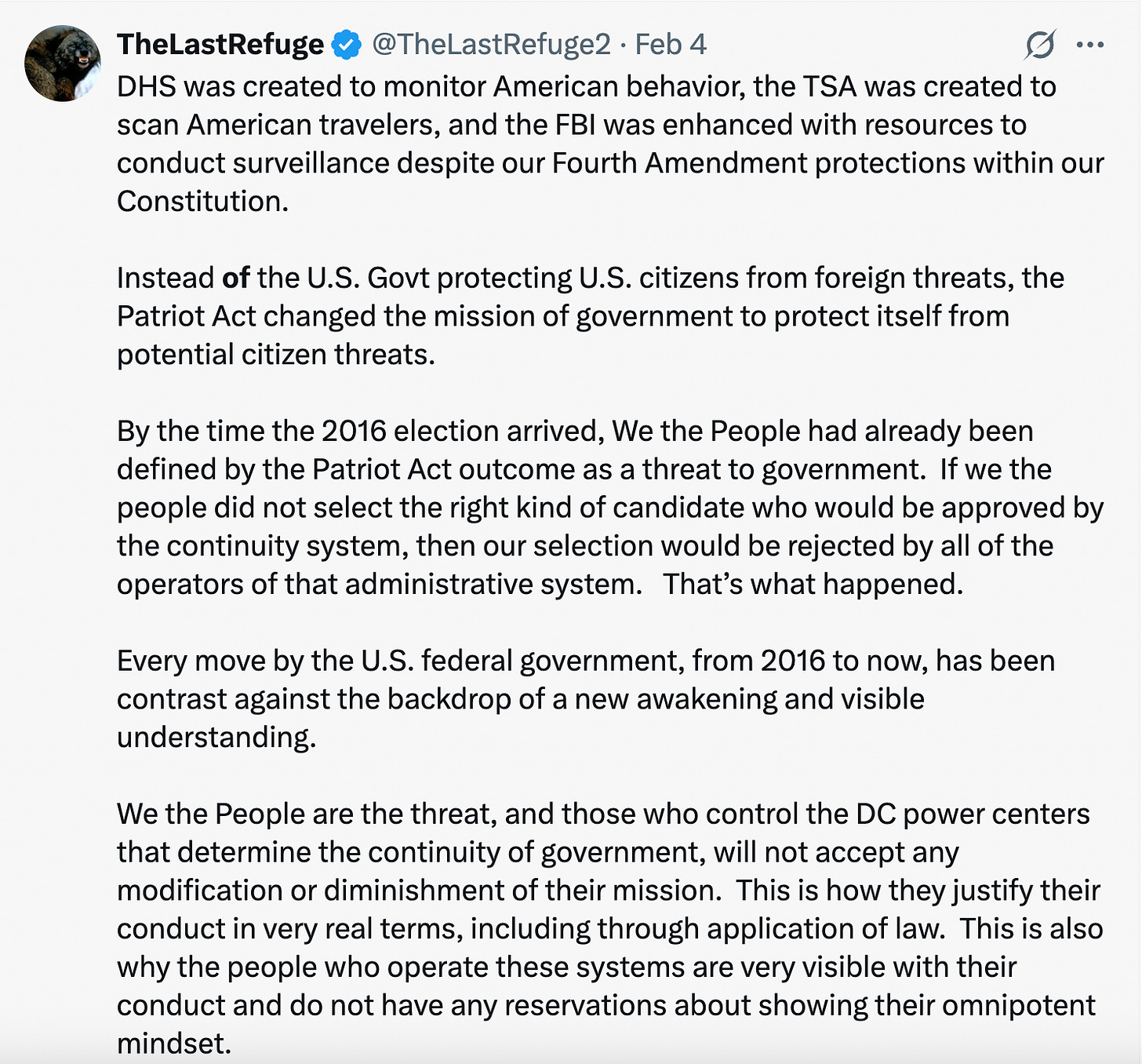 As The LastRefuge on X points out, TSA was created to follow our whereabouts, the FBI can surveil at will, with no warrant, and other agencies within the government can threaten citizens with jail or worse since 2016 and the Patriot Act. Our voices are not meant to be heard, but to be observed so that we can be controlled like animals in a cage.