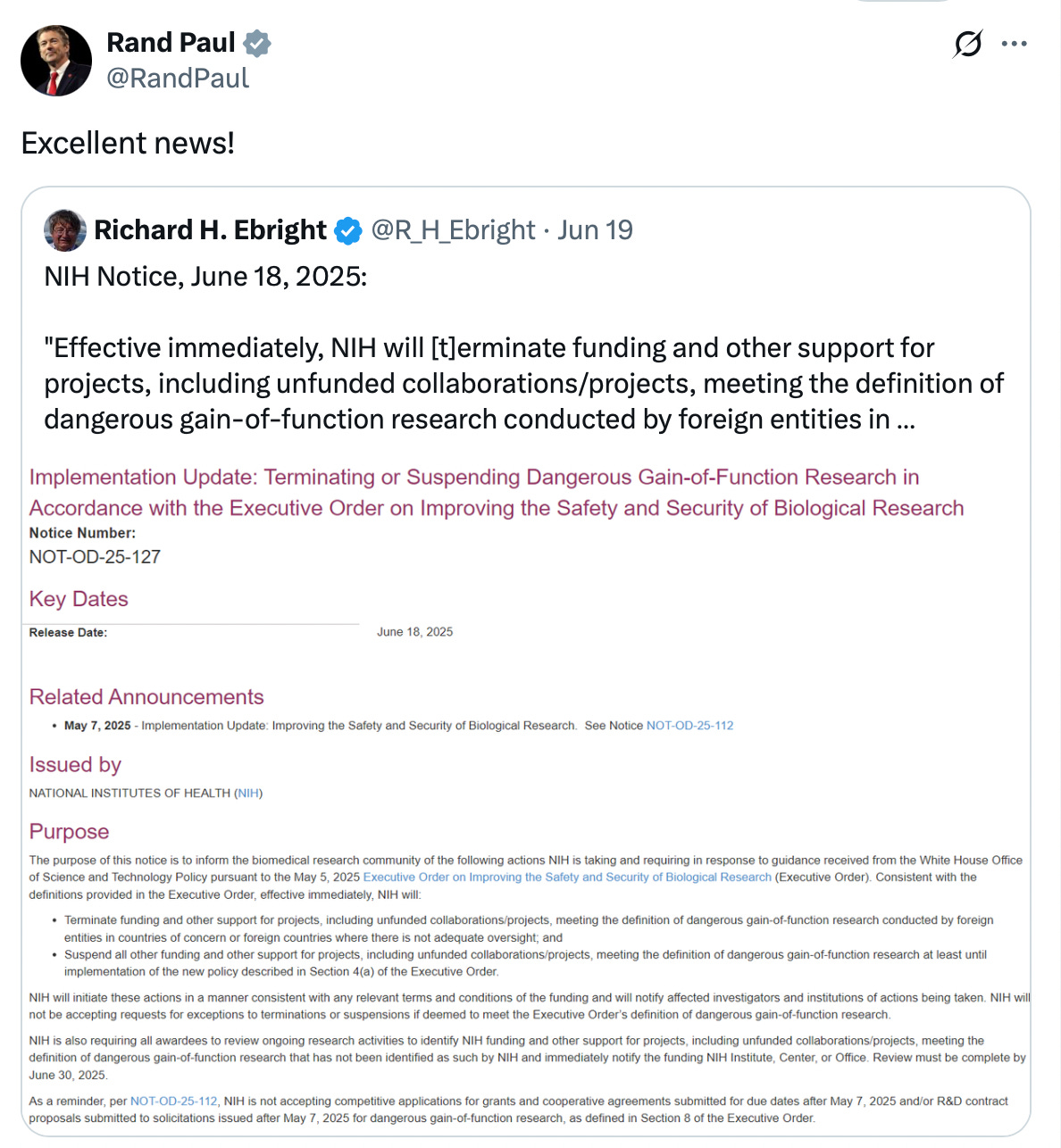 In the aftermath of Sen. Paul’s brave advocacy, the NIH recently announced its termination of gain of function research.