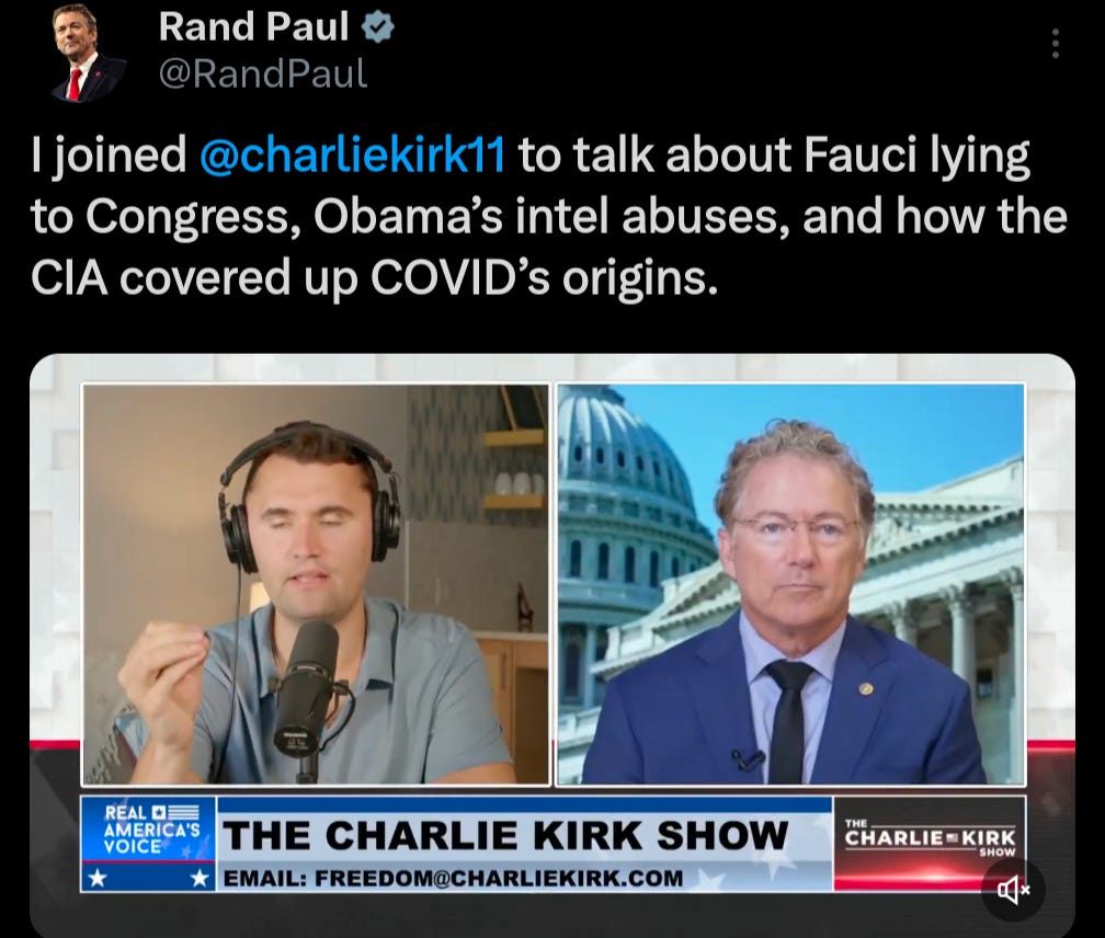 Playback speed×Share postShare post at current timeShare from 0:000:00/0:00Transcript3112562Tulsi Gabbard is Right to Pursue Brennan, ObamaCharlie Kirk and Rand Paul bring the HEAT! America RebornAug 29, 20253112562ShareTranscriptI joined charliekirk11 to talk about Fauci lying to Congress, Obama’s intel abuses, and how the CIA covered up COVID’s origins. — Senator Rand PaulBe sure to check out The Charlie Kirk Show show on Rumble!!This Substack is reader-supported. To receive new posts and support my work, consider becoming a free or paid subscriber.SubscribeDiscussion about this videoCommentsRestacksRand RadioLiberty or Death - Rand Paul 2028Liberty or Death - Rand Paul 2028SubscribeListen onSubstack AppSpotifyPocket CastsRSS FeedAppears in episodeAmerica RebornRecent EpisodesCDC LIED: The vaccines never were safe and effectiveOct 129 minutes of Anthony Fauci completely embarrassing himselfOct 10 • America RebornRand Paul Defends RFK Jr. From the Imbecilic Deep StateOct 7 • America RebornGovt SHUTDOWN Fight AcceleratesOct 5 • America RebornThe government should have followed Rand Paul's Penny PlanOct 3 • America RebornCongress is voting to put us trillions more in debt... AGAINSep 30 • America RebornRand Paul Exposes Fauci’s Shocking Crimes in Must-Read BookSep 30 • America RebornPAUL: No medical reason to give newborns Hep B vaccine Sep 24 • America Reborn