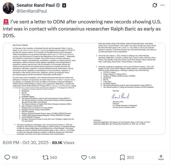 “Even Ralph Baric, world-famous gain-of-function researcher and collaborator with Wuhan’s Dr. Shi, admitted, ‘So they [the Wuhan Institute of Virology] have a very large collection of viruses in their laboratory. And so it’s—you know—proximity is a problem. It’s a problem.’” – Rand Paul