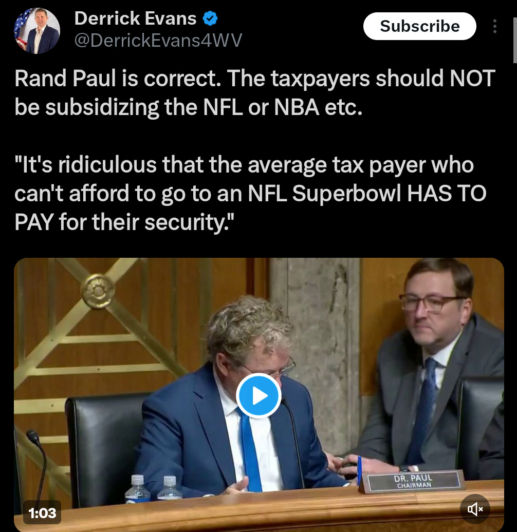 “It’s ridiculous that the average tax payer who can’t afford to go to an NFL Superbowl HAS TO PAY for their security.”